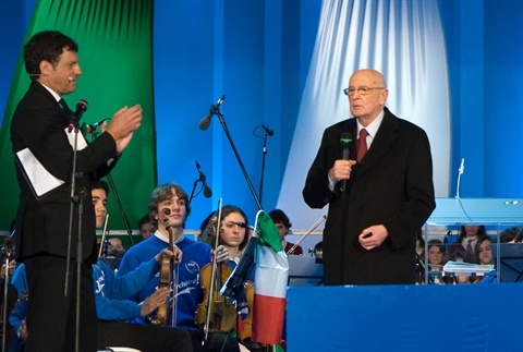 Il Presidente Giorgio Napolitano nel corso del suo saluto agli italiani nella "Notte Tricolore"