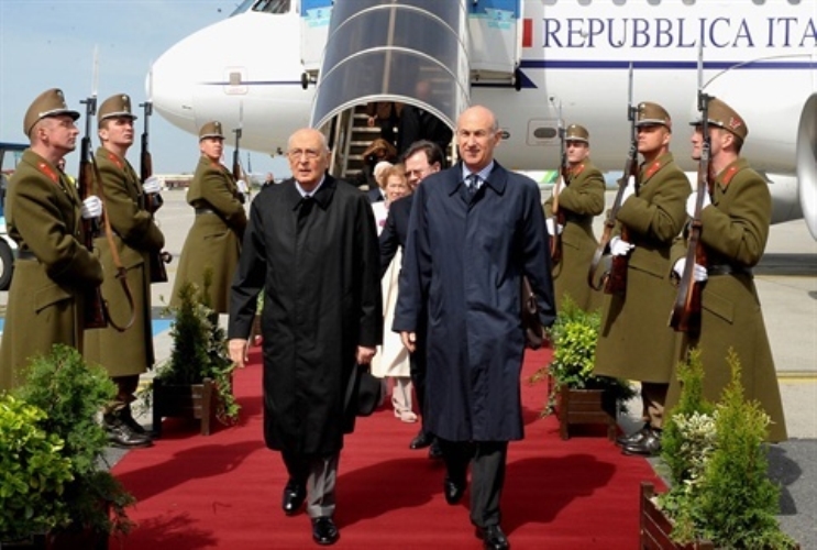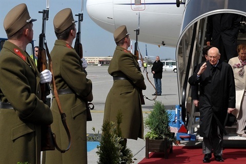 Il Presidente Giorgio Napolitano al suo arrivo all'Aeroporto Ferihegy 2 di Budapest, in occasione del vertice informale Multilaterale dei Capi di Stato dell'Arraiolos Group "Uniti per l'Europa"