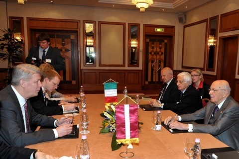 Il Presidente della Repubblica Giorgio Napolitano con Valdis Zatlers, Presidente della Repubblica di Lettonia, durante i colloqui in occasione del vertice informale dei Capi di Stato dell'Arraiolos Group "Uniti per l'Europa"