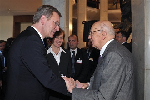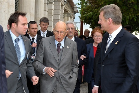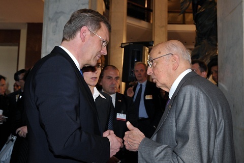 Il Presidente Giorgio Napolitano con Christian Wulff, Presidente della Repubblica Federale Tedesca in occasione del vertice informale dei Capi di Stato dell'Arraiolos Group "Uniti per l'Europa"