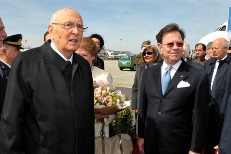 Il Presidente Giorgio Napolitano con l'Ambasciatore Giovan Battista Campagnola al suo arrivo all'Aeroporto Ferihegy 2 di Budapest, in occasione del vertice informale dei Capi di Stato dell'Arraiolos Group "Uniti per l'Europa"