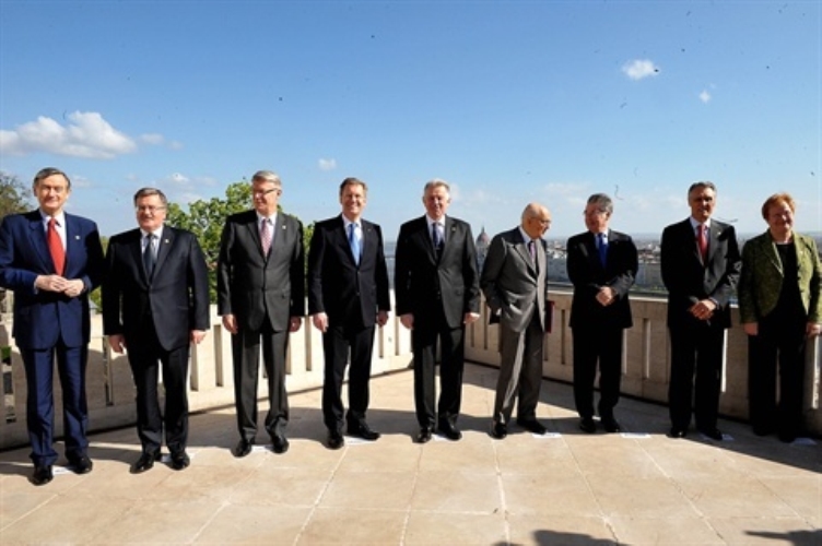 Foto di gruppo dei Capi di Stato nel Salone di Maria Teresa. Nella foto in prima fila: Polonia, Germania, Ungheria, Italia, Portogallo; nella seconda fila: Slovenia, Lettonia, Austria e Finlandia in occasione del vertice informale dei Capi di Stato dell'Arraiolos Group "Uniti per l'Europa"