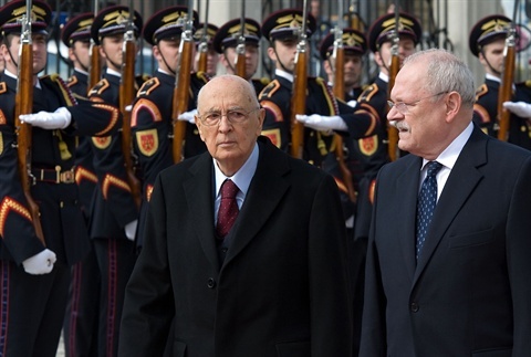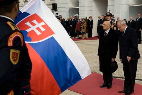 Il Presidente Giorgio Napolitano con il Presidente della Repubblica Slovacca Ivan Gašparovič, durante la cerimonia di benvenuto al Palazzo Presidenziale