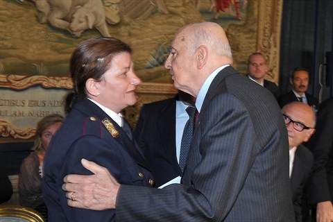 Il Presidente Giorgio Napolitano saluta Carmelina Di Roma, sorella di Ciriaco Di Roma, in occasione della cerimonia del Giorno della Memoria dedicato alle vittime del terrorismo