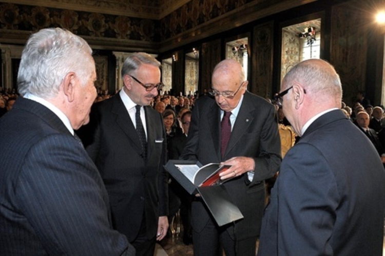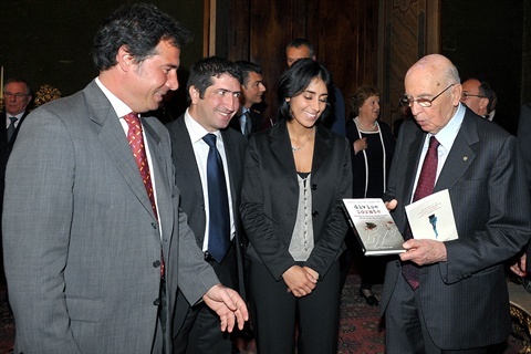 Il Presidente Giorgio Napolitano riceve la prima copia del volume "Nel loro segno" in occasione della cerimonia del Giorno della Memoria dedicato alle vittime del terrorismo