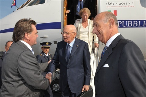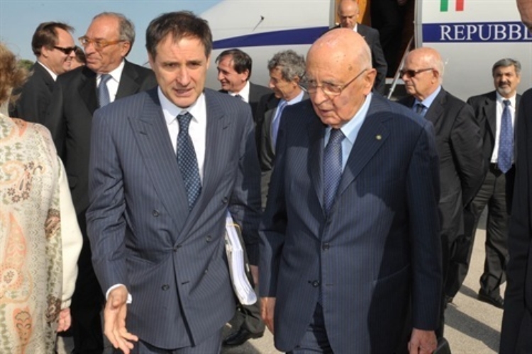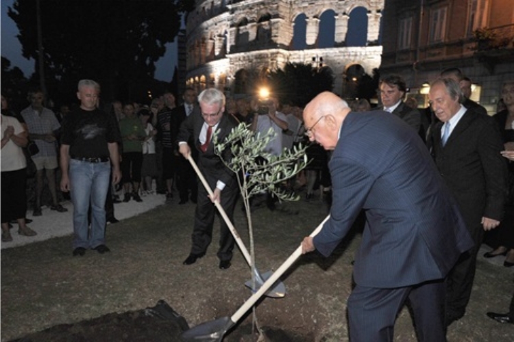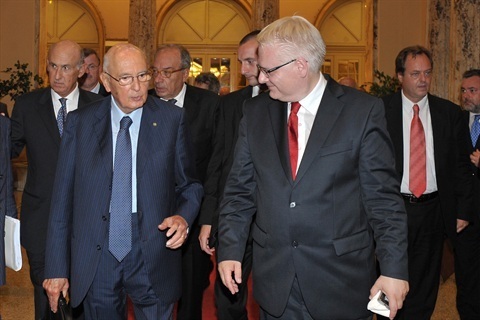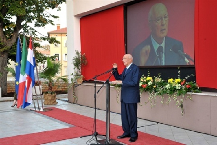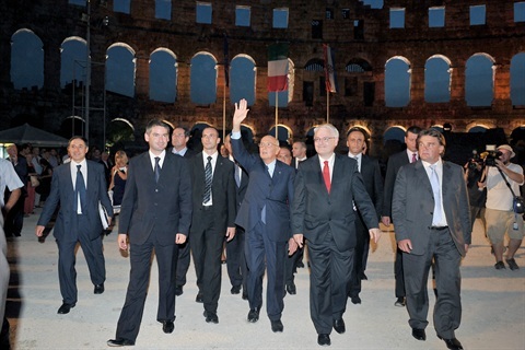 Il Presidente della Repubblica Giorgio Napolitano e il Presidente della Repubblica di Croazia Ivo Josipovic durante la dichiarazione congiunta sul palco dell'Arena di Pola