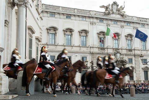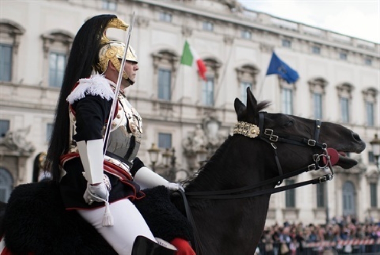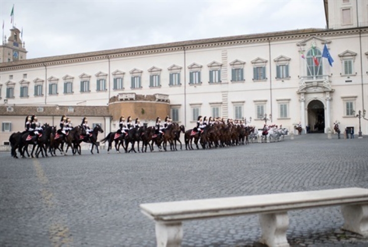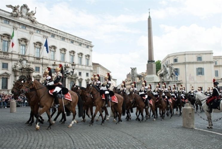 Cambio della Guardia solenne al Palazzo del Quirinale, con lo schieramento e lo sfilamento del Reggimento Corazzieri e della Fanfara del IV Reggimento Carabinieri a cavallo, in occasione della Festa della Repubblica