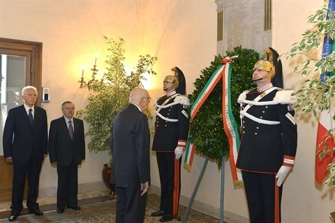 Il Presidente Giorgio Napolitano durante la deposizione di una corona d'alloro sulla lapide dei Caduti del Quirinale, nel Giorno dell'Unità Nazionale e Giornata delle Forze Armate