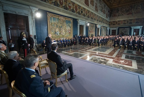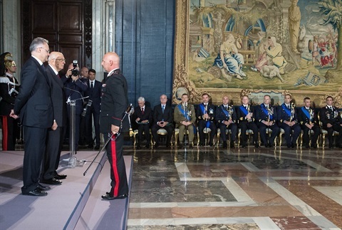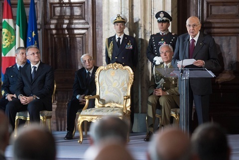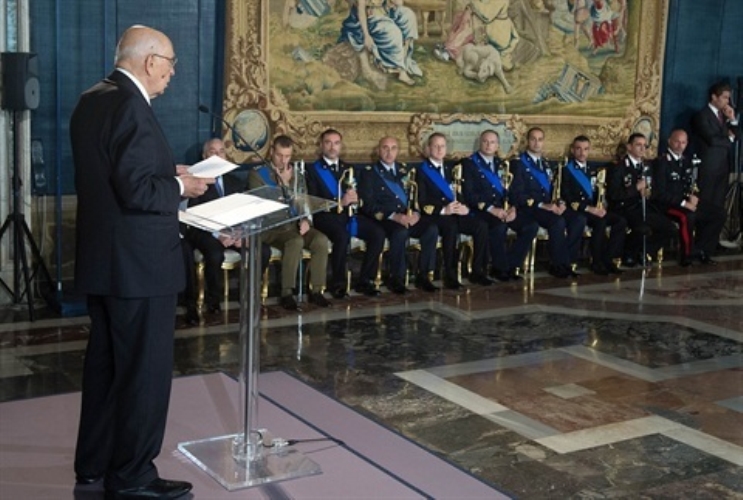 Il Presidente Giorgio Napolitano nel corso della celebrazione del Giorno dell'Unità Nazionale e Giornata delle Forze Armate, a destra nella foto gli insigniti dell'OMI