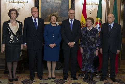 Il Presidente Giorgio Napolitano con il Presidente della Repubblica di Portogallo Anibal Cavaco Silva, il Re di Spagna Juan Carlos e le rispettive consorti al Palacio da Cidadela di Cascais