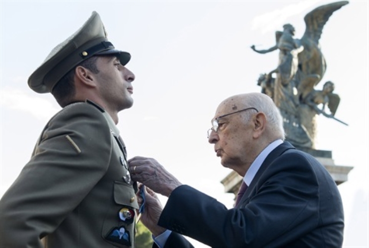 Il Presidente Giorgio Napolitano consegna la Medaglia d'Oro al Valor Militare al Caporal Maggiore Capo dell'Esercito Andrea Adorno
