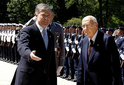 Il Presidente della Repubblica Federale di Germania Horst Kohler accoglie il Presidente della Repubblica Italiana Giorgio Napolitano all'arrivo al Castello di Bellevue.