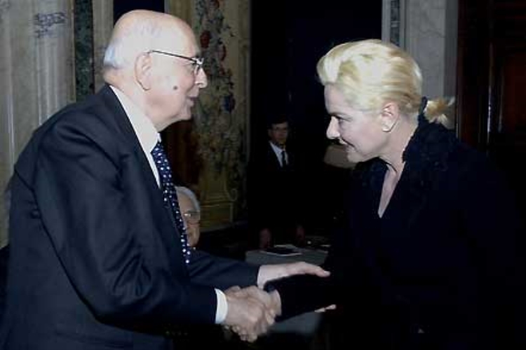 Il Presidente Giorgio Napolitano con Monica Guerritore al termine della lettura, da parte dell'Attrice, di alcuni brani di lettere scritte da Enzo Sereni, deportato in un campo di concentramento in occasione della celebrazione del "Giorno della Memoria"