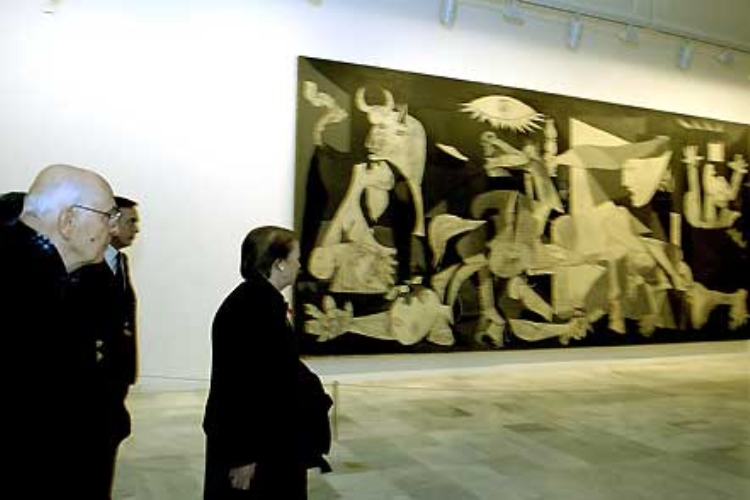 Il Presidente Giorgio Napolitano con la moglie Clio durante la visita al Museo Nazionale Centro di Arte "Reina Sofia", davanti al "Guernica" di Pablo Picasso.