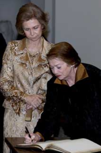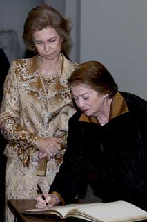 La Signora Clio Napolitano con accanto la Regina Sofia, firma il libro d'onore al termine della visita al Museo del Prado