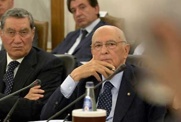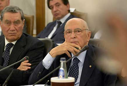 Il Presidente Giorgio Napolitano, con a fianco il Vice Presidente del Consiglio Superiore della Magistratura Nicola Mancino, nel corso dei lavori dell'Assemblea plenaria del CSM.