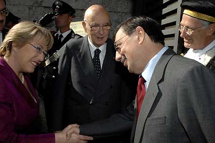 Il Presidente Giorgio Napolitano con la Signora Michelle Bachelet, Presidente della Repubblica del Cile accolti all'arrivo all'Università degli Studi Roma Tre dal Ministro Fabio Mussi e dal Rettore Guido Fabiani