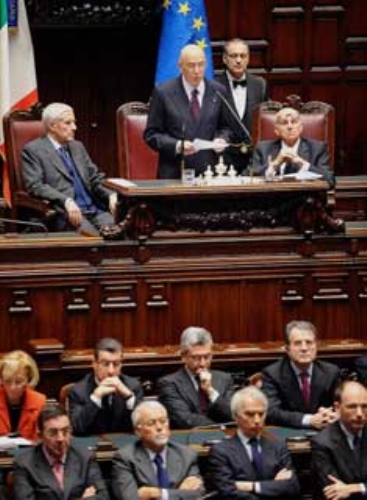 Il Presidente Giorgio Napolitano con i Presidenti di Senato e Camera, Franco Marini e Fausto Bertinotti, durante il suo intervento per la celebrazione del 60°anniversario della Costituzione