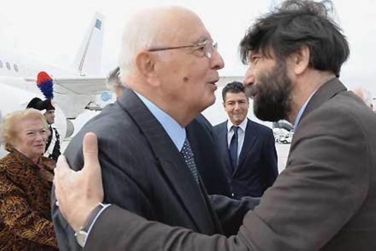 Il Presidente Giorgio Napolitano e la moglie Clio, accolti dal Sindaco Cacciari all'arrivo in Aeroporto