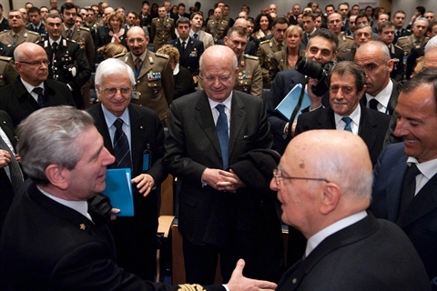 Il Presidente Giorgio Napolitano con il Ministro degli Esteri Franco Frattini e il Presidente del Comitato Militare della NATO Amm. Giampaolo Di Paola, al termine dell'incontro con una rappresentanza del personale italiano in servizio presso la NATO