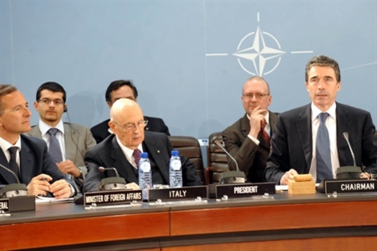 Il Presidente Giorgio Napolitano con il il Segretario Generale della NATO Anders Fogh Rasmussen e il Ministro degli Esteri Franco Frattini, nel corso della sessione straordinaria del Consiglio Atlantico