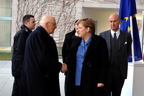 Il Presidente Giorgio Napolitano accolto dal Cancelliere della Repubblica Federale di Germania Angela Merkel
