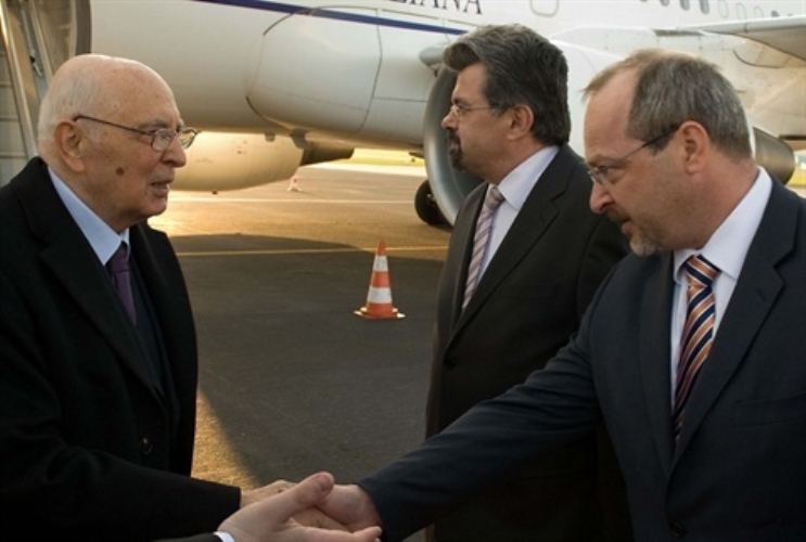 Il Presidente Giorgio Napolitano al suo arrivo a Praga accolto dal Vice Ministro degli Affari Esteri, Tomàs Dub, e dal Segretario Generale della Presidenza della Repubblica Ceca Jirì Weigl
