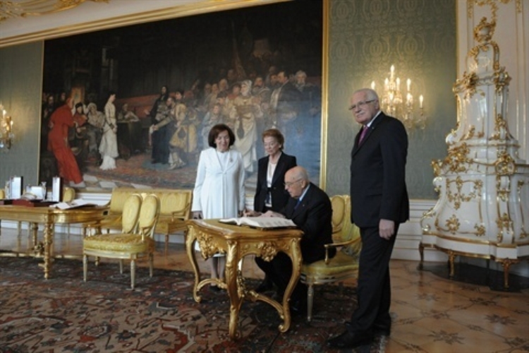 Il Presidente Giorgio Napolitano e il Presidente della Repubblica Ceca Vaclav Klaus con le rispettive consorti, durante la firma del registro d'onore