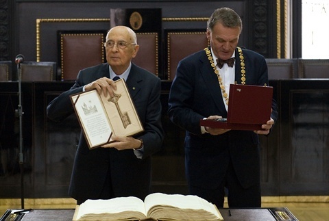 Il Presidente Giorgio Napolitano mostra le Chiavi della città di Praga, consegnate dal Sindaco Bohuslav Svobodova