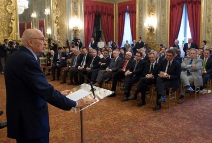 Il Presidente Giorgio Napolitano riceve il tradizionale "Ventaglio" da Pierluca Terzulli, Presidente dell'Associazione Stampa Parlamentare