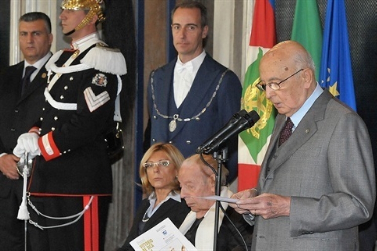 Il Presidente Giorgio Napolitano con Gian Luigi Rondi, Presidente del Premio "Vittorio De Sica" in occasione della cerimonia della Giornata dello Spettacolo