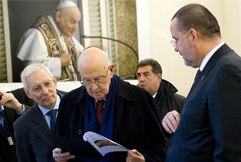 Il Presidente Giorgio Napolitano accompagnato dal Presidente e dal Direttore della Biblioteca Giuseppe Dossetti, Prof. Valerio Onida e Prof. Alberto Melloni, visita la sede della Biblioteca presso la Fondazione per le Scienze Religiose Giovanni XXIII
