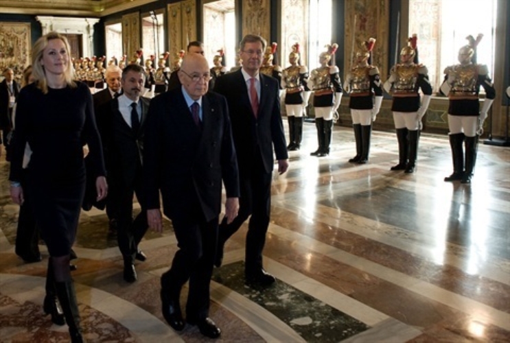 Il Presidente Giorgio Napolitano con il Presidente della Repubblica Federale di Germania Christian Wulff e la consorte, in occasione della cerimonia di congedo al termine della visita al Quirinale