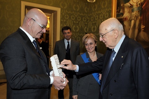 Il Presidente Giorgio Napolitano con la Dott.ssa Angela Maria Quaquero, Vice Presidente della Provincia di Cagliari mentre suona le pietre di Pinuccio Sciola