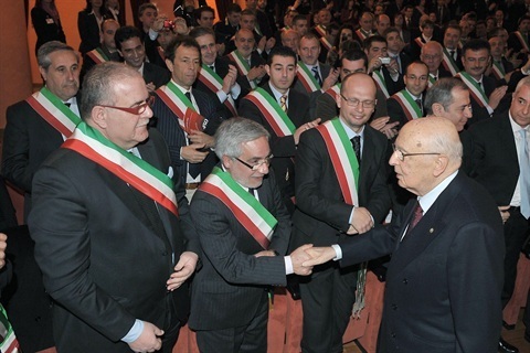Il Presidente Giorgio Napolitano con i Sindaci della provincia di Sassari in occasione del Convegno per le celebrazioni del 450° anniversario di Fondazione dell'ateneo e del 150° dell'Unità d'Italia