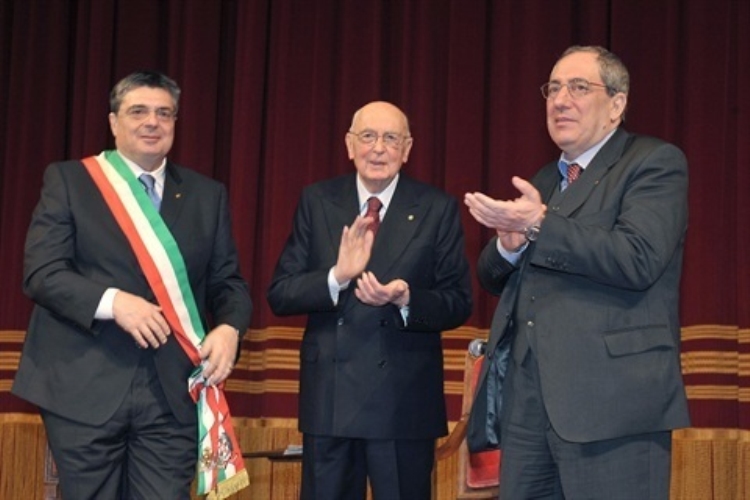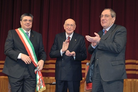 Il Presidente Giorgio Napolitano plaude dopo l'Inno sardo da parte del Gruppo Etnomusicologico ICHNUSS dell'Università degli Studi di Sassari nel corso del Convegno per le celebrazioni del 450° anniversario di Fondazione dell'Ateneo e del 150° dell'Unità d'Italia,
