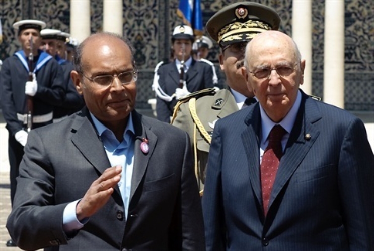 Il Presidente Giorgio Napolitano accolto al suo arrivo al Palazzo Presidenziale da Moncef Marzouki, Presidente della Repubblica Tunisina