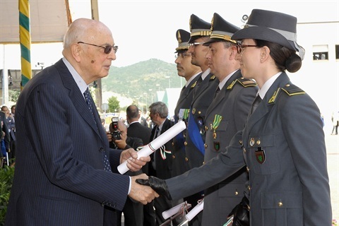 Il Presidente Giorgio Napolitano durante la consegna di una Medaglia d'Oro al Merito Civile alla Bandiera di Istituto della Scuola Ispettori e Sovrintendenti, in occasione del 238° Anniversario di fondazione del Corpo della Guardia di Finanza