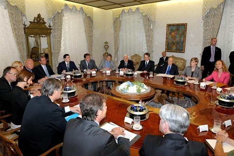 Il Presidente Giorgio Napolitano e il Presidente della Repubblica di Slovenia Danilo Turk durante i colloqui allargati alle delegazioni ufficiali