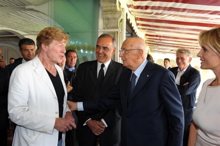 Il Presidente Giorgio Napolitano con Robert Redford, Isabella Ferrari e Ermanno Olmi alla Biennale del cinema di Venezia
