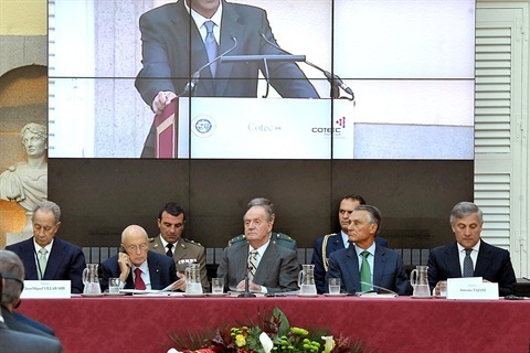 Il Presidente Giorgio Napolitano con S.M. il Re di Spagna Juan Carlos I e il Presidente della Repubblica Portoghese Annibal Cavaco Silva durante la sessione finale del Simposio nel patio de Asturias