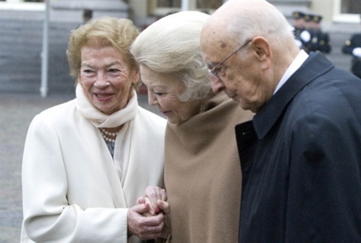 Il Presidente Giorgio Napolitano, la Sig.ra Clio e S.M. la Regina Beatrix durante la cerimonia di commiato