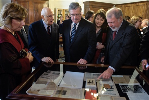 Il Presidente Giorgio Napolitano con il Segretario Generale dell'Istituto Italiano per gli0 Studi Storici Marta Herling-Grudzinski, il Presidente della Repubblica di Polonia Bronislaw Komorowski e Piero Craveri