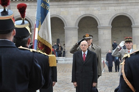 Il Presidente Giorgio Napolitano durante gli onori militari all'Eliseo