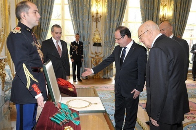 Lo scambio di decorazioni tra il Presidente Napolitano e il Presidente Hollande