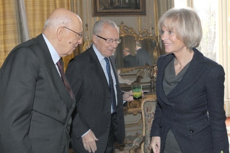Il Presidente Giorgio Napolitano con l'ex Presidente della Commissione Europea Jacques Delors e con Elisabeth Guigou, Presidente della Commissione Affari Esteri dell'Assemblea Nazionale Francese