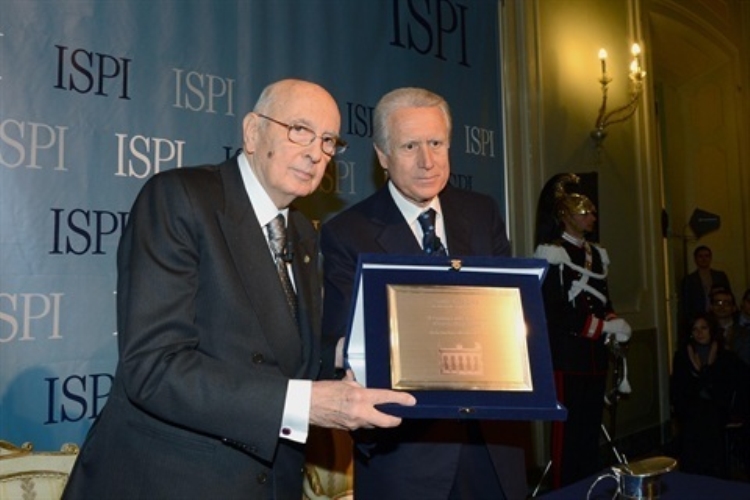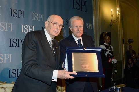 Il Presidente della Repubblica Giorgio Napolitano riceve dall'Amb. Giancarlo Aragona, Presidente dell'Istituto per gli Studi di Politica Internazionale, la targa ricordo "Boris Biancheri" 2013 al termine della conferenza conclusiva del ciclo "L'Italia e la Politica Internazionale. Nuove responsabilità o rischio marginalizzazione?"