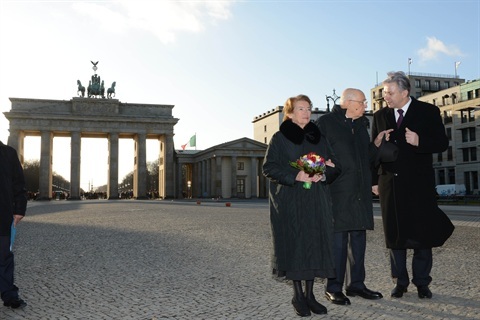 Il Presidente Giorgio Napolitano la signora Clio e il Sindaco e Governatore del Land di Berlino di fronte alla Porta di Brandeburgo in occasione della Visita di Stato nella Repubblica Federale di Germania