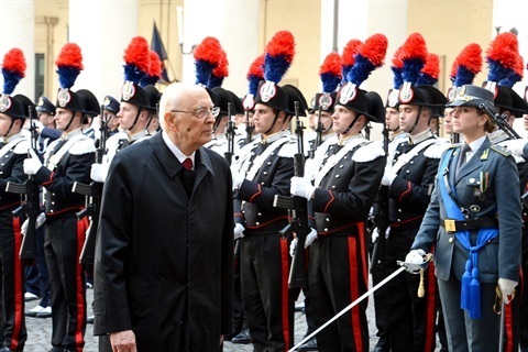 Il Presidente Giorgio Napolitano passa in rassegna un picchetto d'onore dei Corazzieri in occasione del suo insediamento al Palazzo del Quirinale