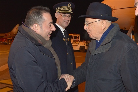 Il Presidente Giorgio Napolitano con Gianni Pittella, Vice Presidente del Parlamento Europeo e il Prefetto della Regione dell'Alsazia Stephane Bouillon,all'Aeroporto di Strasburgo - Entzheim